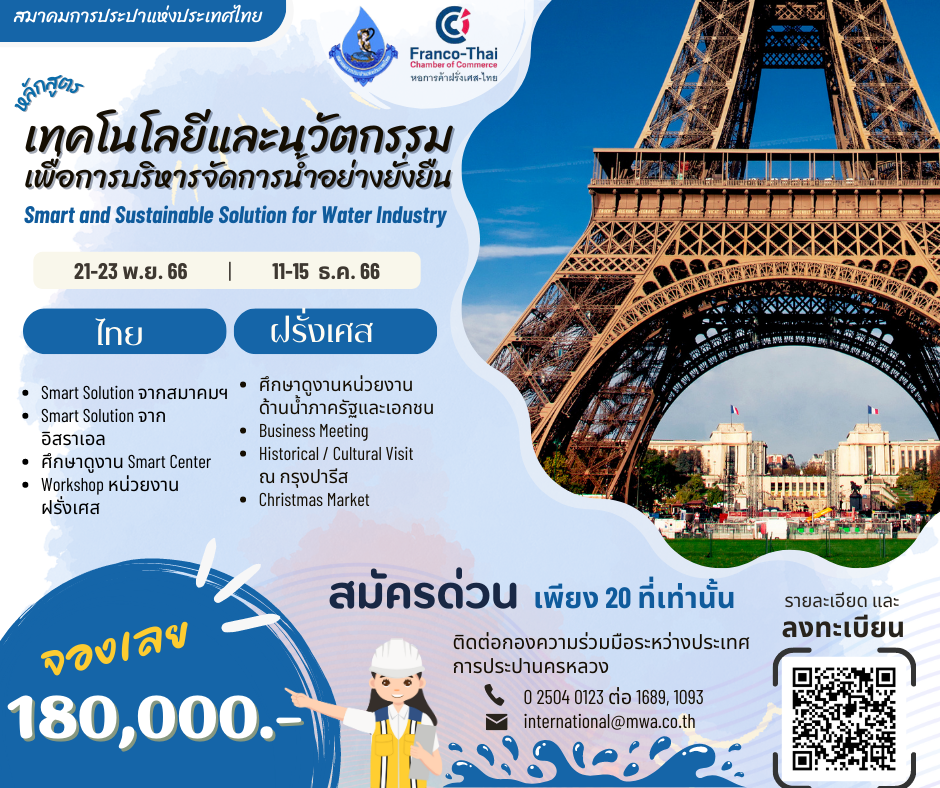 สปปท. ร่วมกับ หอการค้าฝรั่งเศส-ไทย และ Business France จัดหลักสูตรสำหรับผู้บริหาร เพื่อเรียนรู้และแลกเปลี่ยนองค์ความรู้ ทคโนโลยี และนวัตกรรมสมัยใหม่ เพื่อการจัดการน้ำอย่างยั่งยืน โดยผู้เชี่ยวชาญด้านน้ำทั้งในประเทศและต่างประเทศ และศึกษาดูงาน ณ องค์กรและบริษัทชั้นน้ำในประเทศฝรั่งเศส หมวดวิชาการและศึกษาดูงานในประเทศ